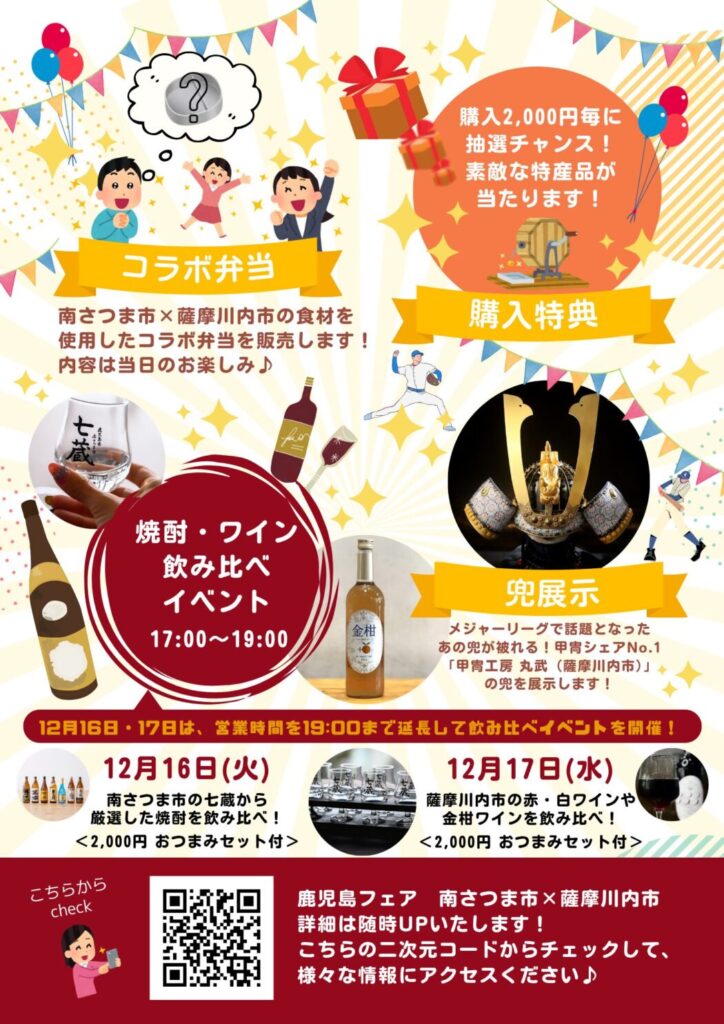 | 催し物 | ①鹿児島コラボ弁当(16日&17日 数量限定) ②12月16日(火)南さつま七蔵焼酎飲み比べ体験 ③12月17日(水)薩摩川内市ワイン飲み比べ体験 ④2000円以上の購入でハズレ無し豪華ガラポン!! |