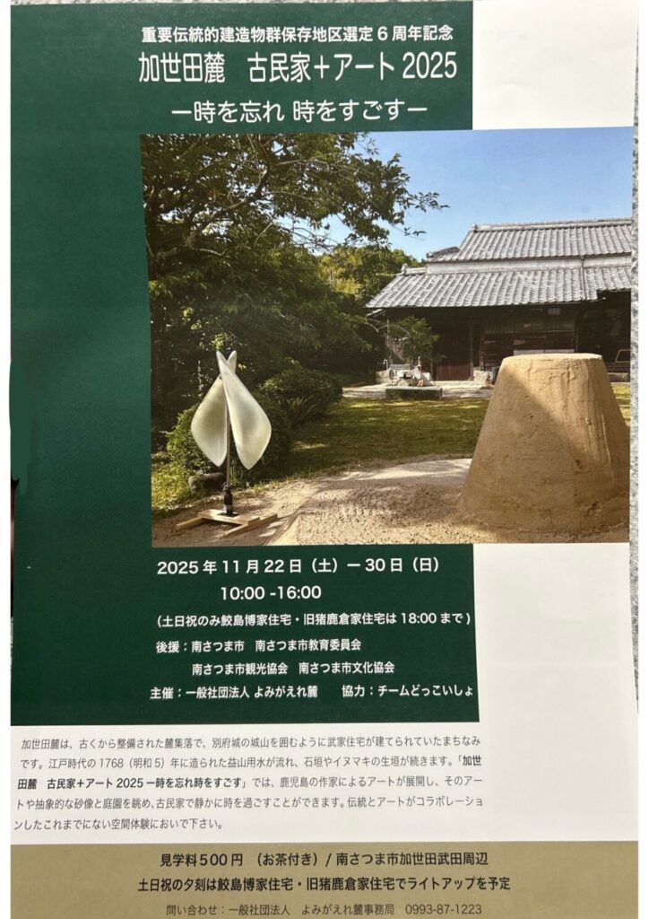 今回のイベントでは、鹿児島の作家によるアートが展開し、そのアートや抽象的な砂像と庭園を眺め、古民家で静かに時を過ごすことができます。伝統とアートがコラボレーションした空間体験においでください。