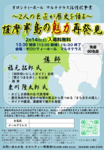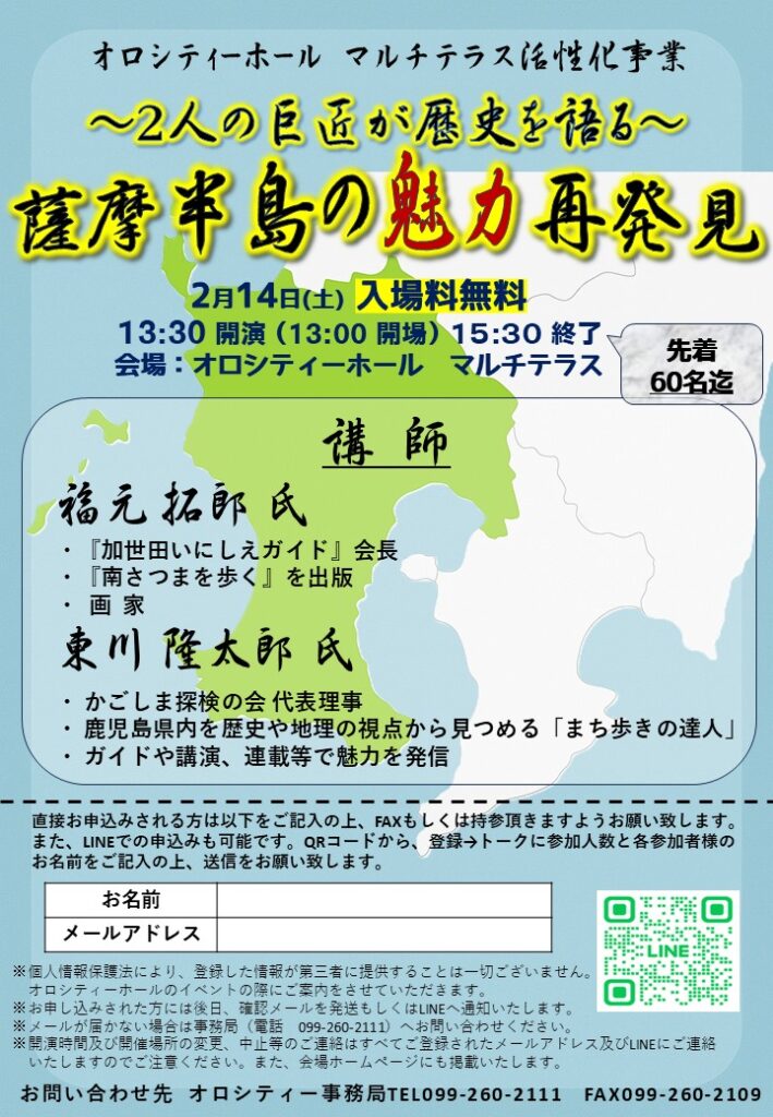 オロシティホール マルチテラス活性化事業として、2月14日(土)に画家の福元 拓郎 氏と『かごしま探検の会』の代表理事を務める東川 隆太郎 氏の2名による講演会を開催いたします。古き良き歴史を振り返りながら、新たな観光スポットを発見できるチャンス!ぜひご参加ください。