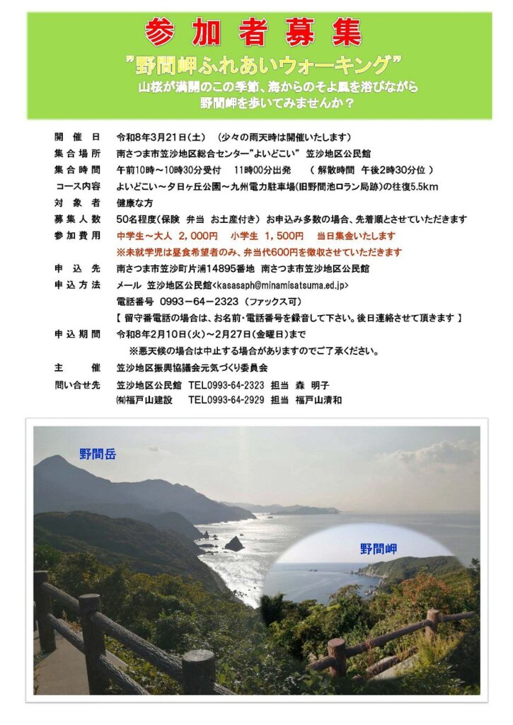| 申込 | 2026年2月10日(火)~2月27日(金) 笠沙地区公民館主事 (笠沙町片浦14895番地) ※留守番電話の場合は、お名前・電話番号を録音してください。後日連絡させていただきます。