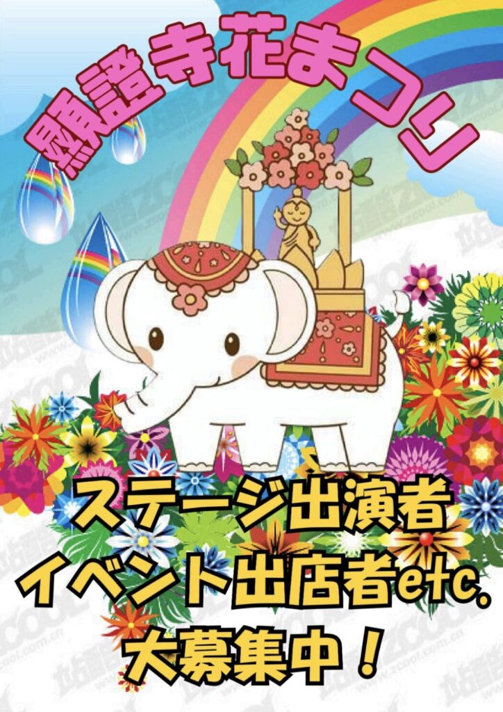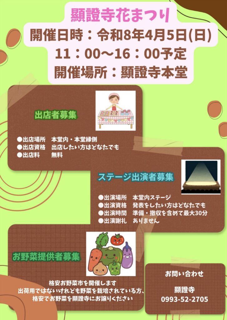 本堂内でのステージに出演したい方や出店者を募集しているとのことです。 詳しくは、顕證寺までお問合せください。(℡0993-52-2705)
