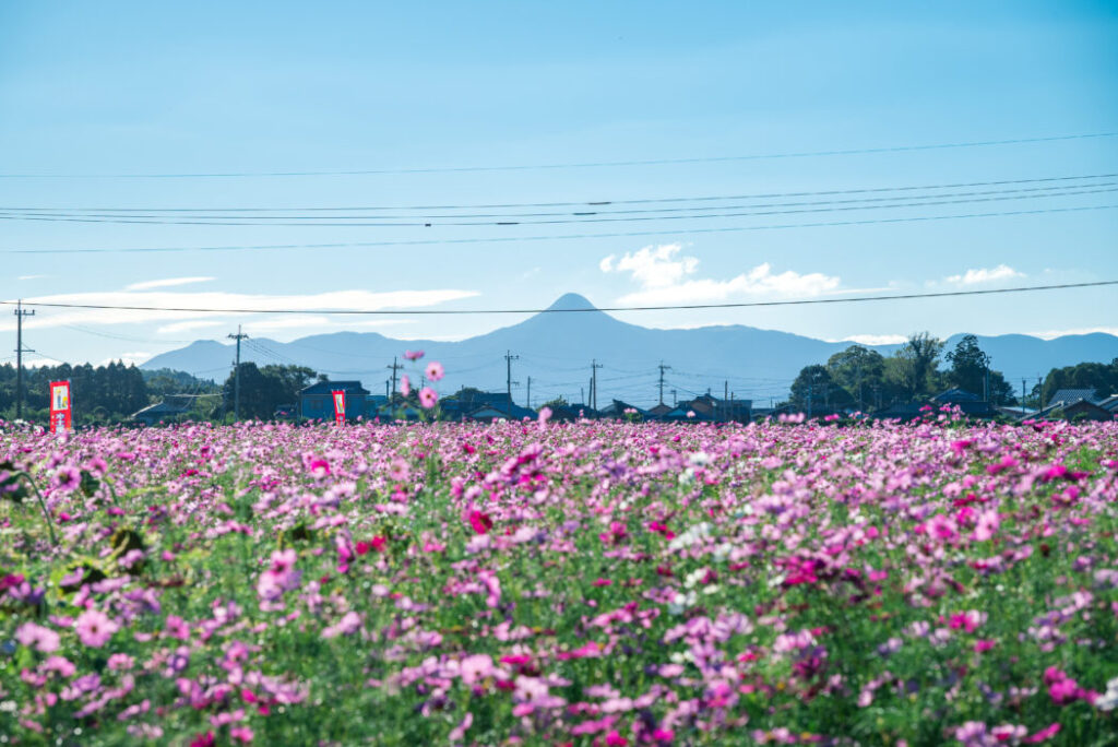 山腹の8合目にはニニギノミコト、コノハナサクヤヒメノミコト、ヒコホホデミノミコトらを祭る野間神社があり、車で行くことができます。